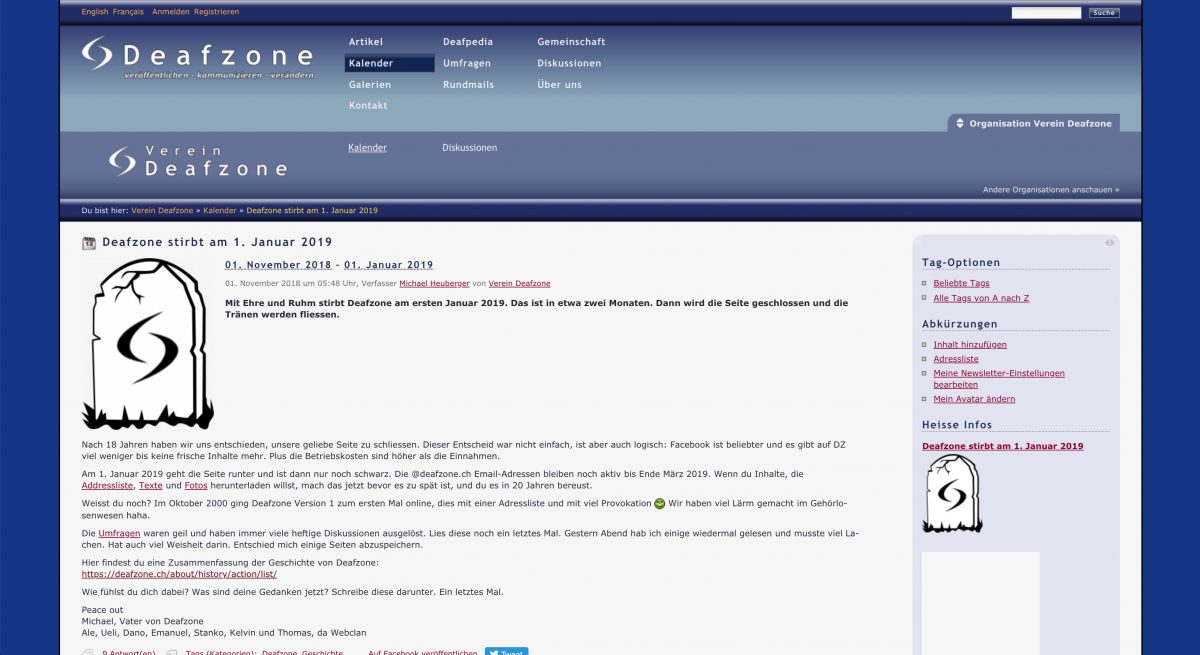 Nach 18 Jahren ist die Website ab heute, 1. Januar 2019 offline. Die Begründung: „Facebook ist beliebter und es gibt auf Deafzone viel weniger bis keine frische Inhalte mehr. Plus die Betriebskosten sind höher als die Einnahmen.“