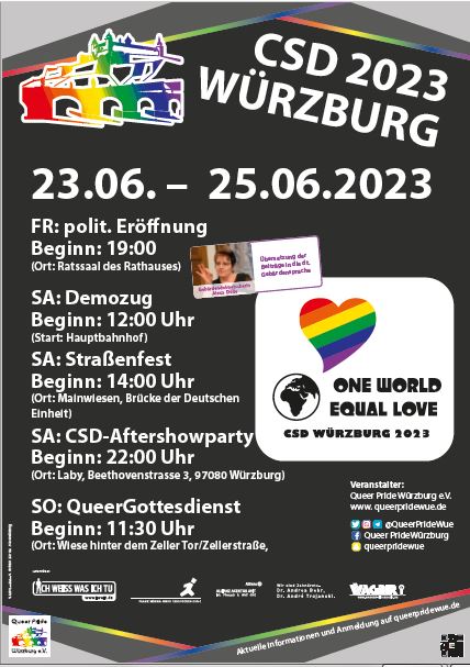 wir laden alle herzlich ein, am CSD Würzburg teilzunehmen. Die politische Eröffnung findet am Fr. 23.06.2023 im Rathaus Würzburg (Rückermainstr. 2, 97070 Würzburg) statt und wird gebärdendolmetscht.